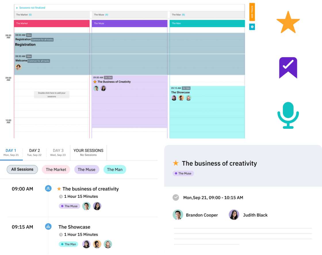 Los organizadores pueden crear un sitio web completamente personalizado para su evento en cuestión de minutos, sin requerir experiencia técnica. El generador de sitios con arrastrar y soltar incluye: