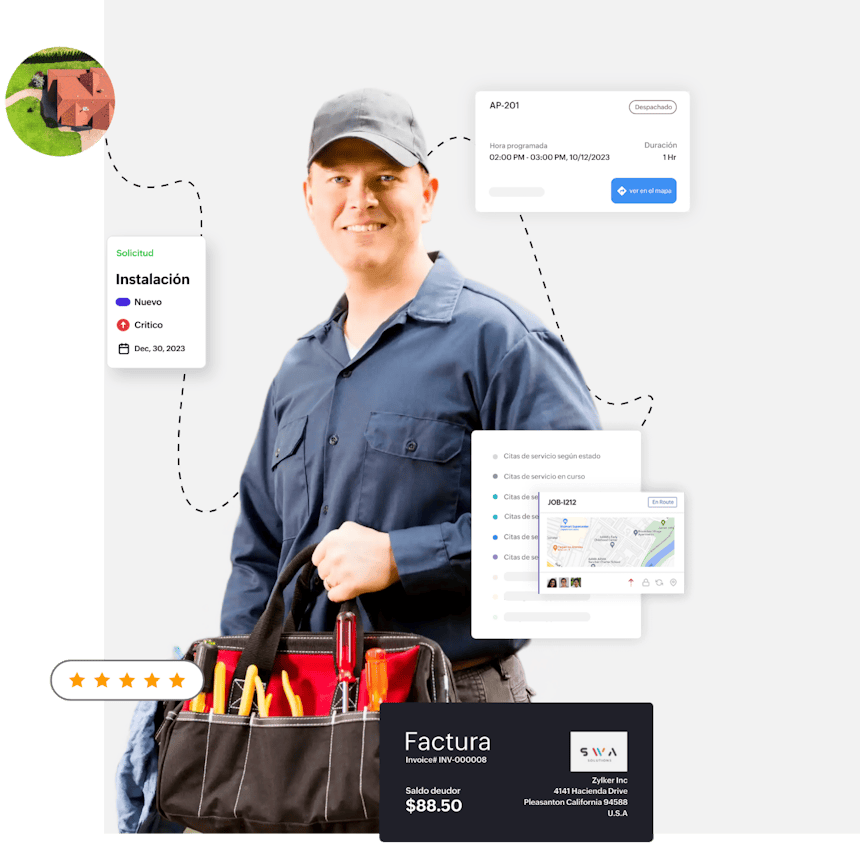 Pero existe una solución: Zoho FSM (Field Service Management) integrado con Zoho CRM Plus. Esta plataforma todo en uno transforma completamente cómo manejas tus operaciones, mejora la satisfacción de tus clientes y, lo más importante, aumenta significativamente tu rentabilidad.