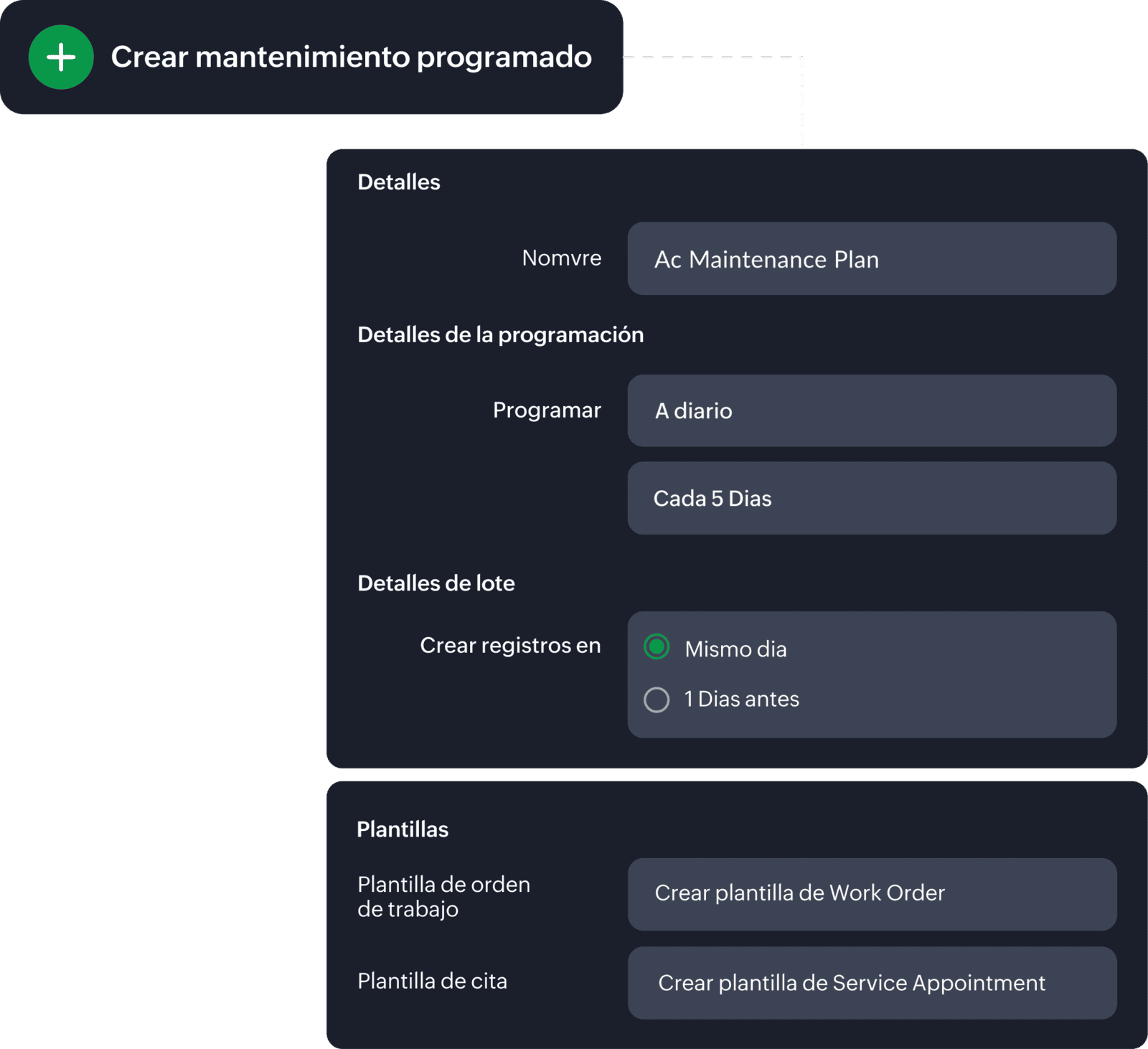 Una de las funcionalidades más valiosas es el mantenimiento programado automático. Configura servicios recurrentes (mensuales, trimestrales, anuales) y Zoho FSM genera automáticamente órdenes de trabajo y citas según el calendario.